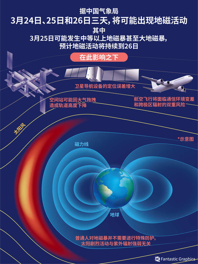 3月24日,中国气象局国家空间天气监测预警中心发布消息称,3月24日、25日和26日三天可能出现地磁活动,其中3月25日可能发生中等以上地磁暴甚至大地磁暴,预计地磁活动将持续到26日。