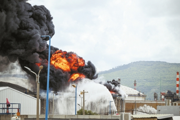 3月30日,以色列北部城市海法的炼油厂在导弹袭击中起火。新华社 发