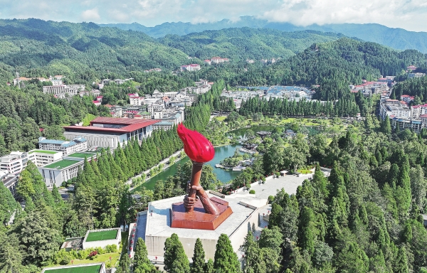 位于江西井冈山市的“星火相传”雕塑(2023年6月28日摄,无人机照片)。新华社记者 万象 摄